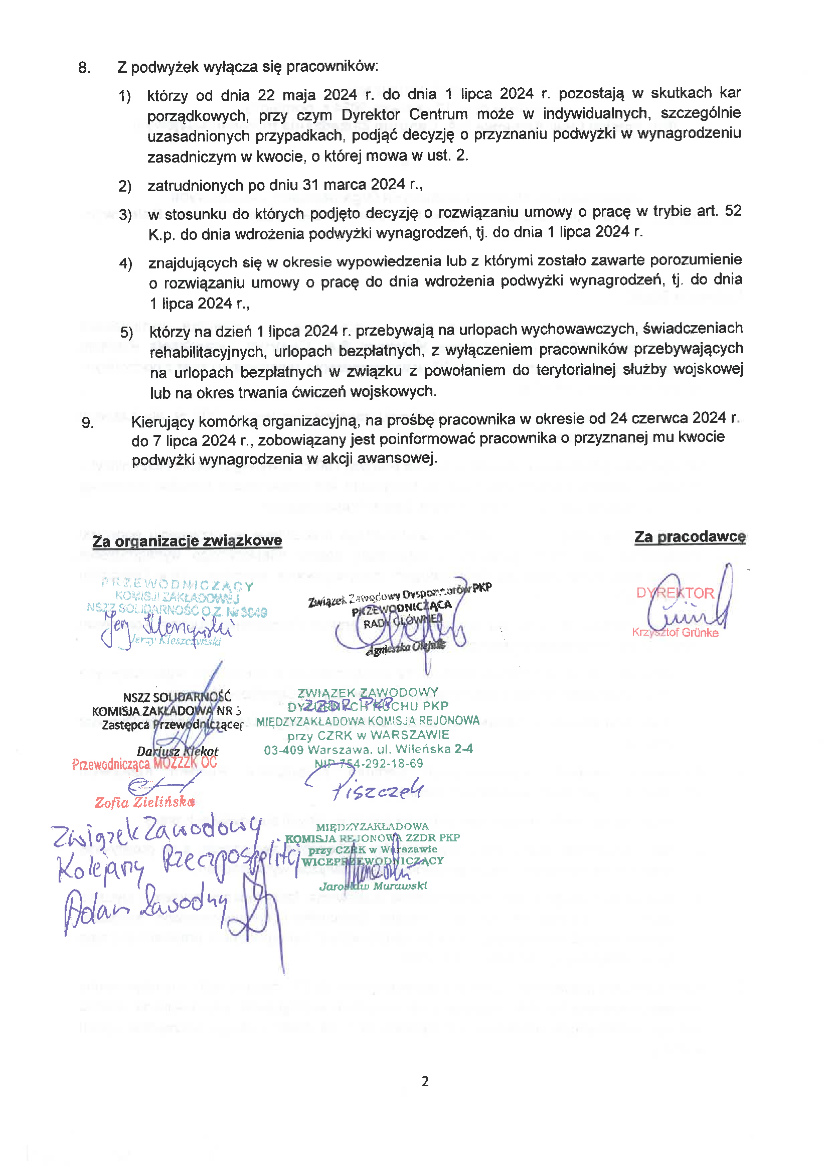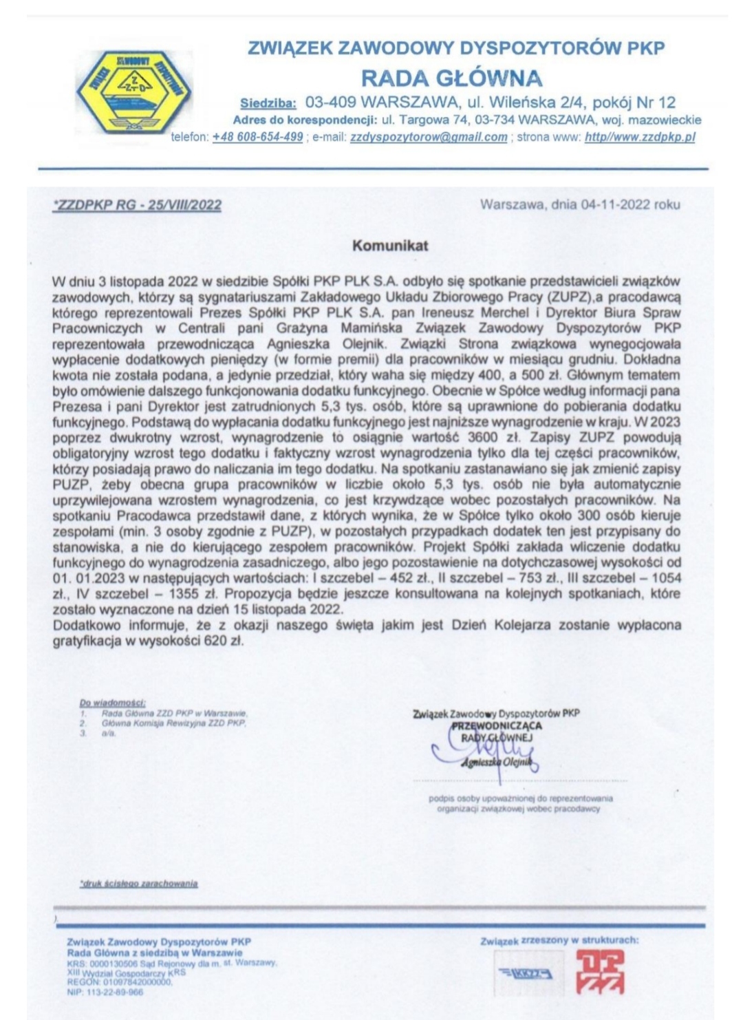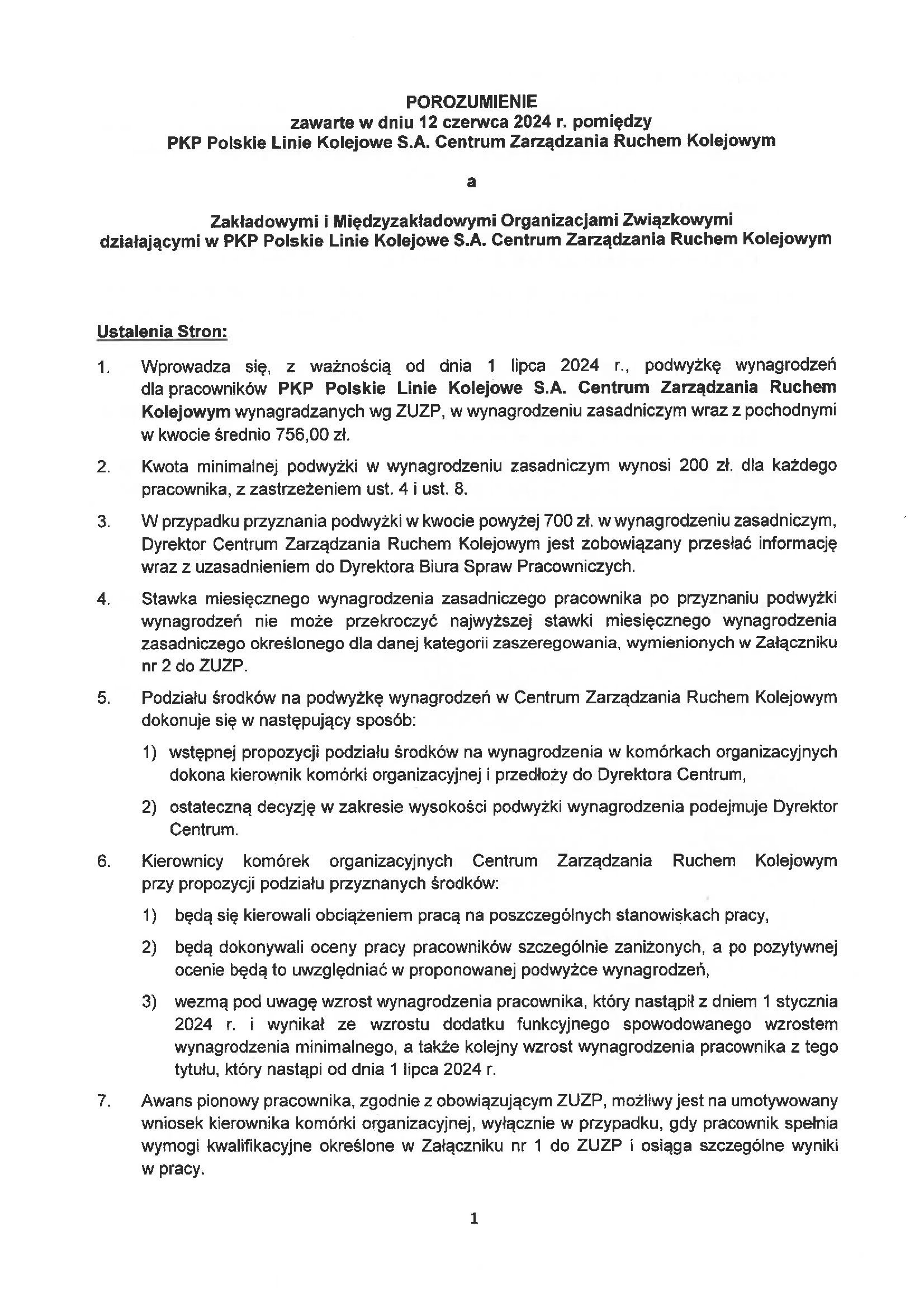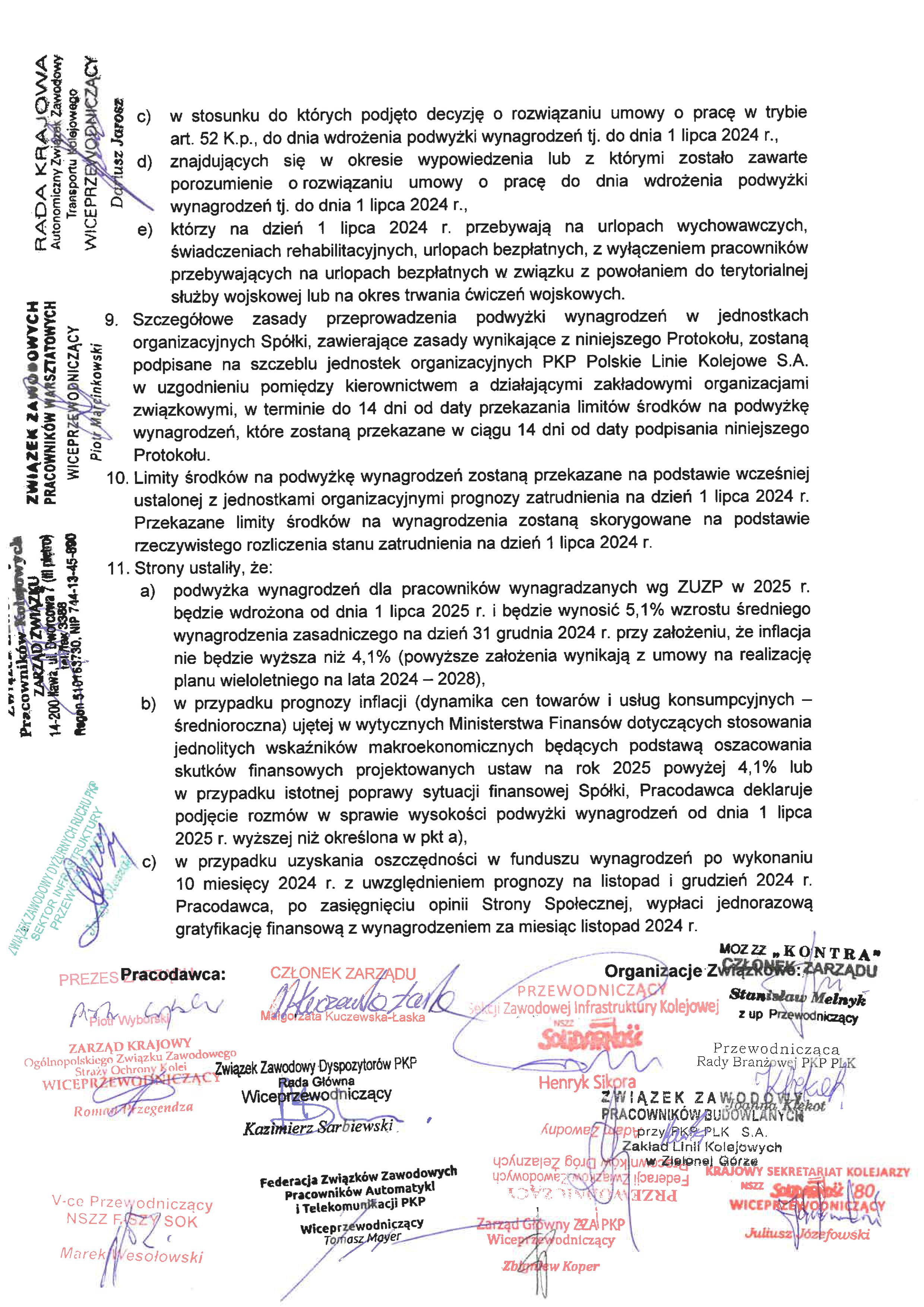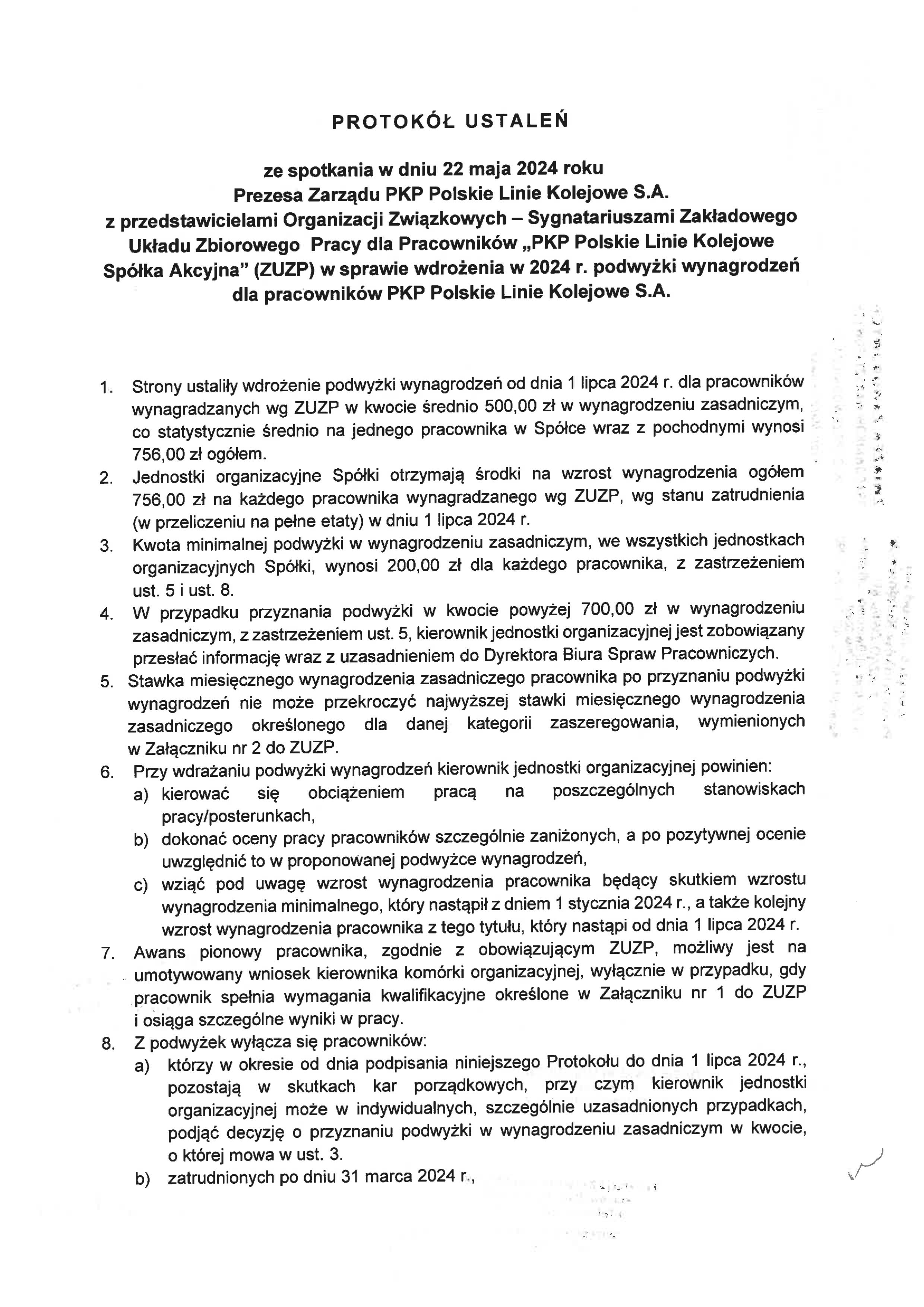 dotyczące podwyżki wynagrodzeń dla pracowników Polskich Lini Kolejowych. Kwota podwyżki od 1 lipca 2024 roku wynosi 500 zł.